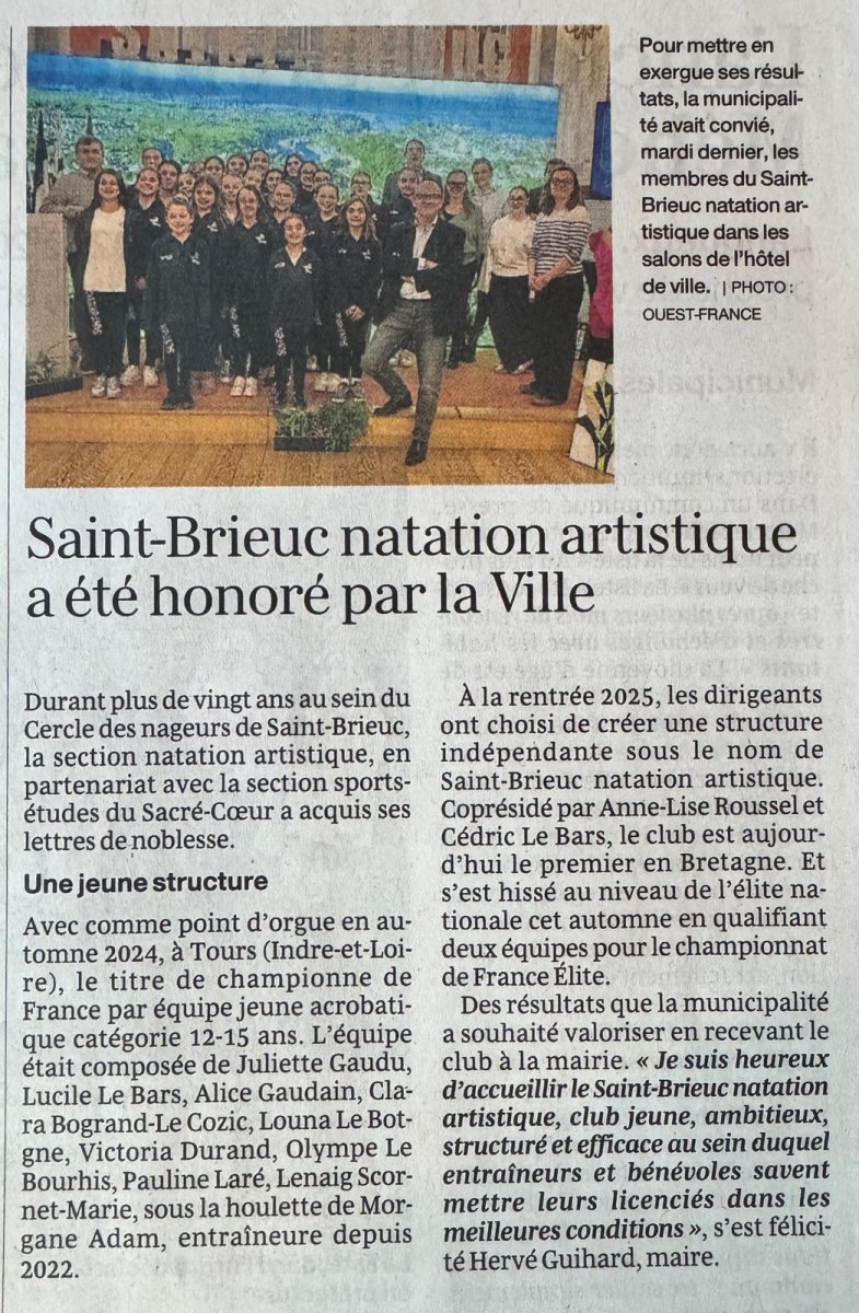 Ouest France - Saint Brieuc natation artistique a été honoré par la ville